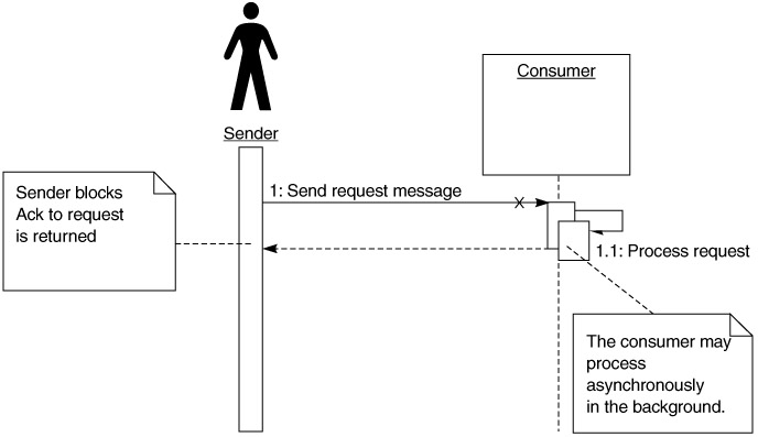 Synchronous with acknowledgment. The receiver does not send a response but sends more of a "got it" acknowledgment (Figure 11.23). The client remains blocked until it receives the acknowledgment, which may not even relate to the original message (but usually does). Its purpose is to notify the client that the message was received and to unblock the calling thread. This is often used to implement use cases corresponding to a synchronous-update messaging pattern. This involves changing business data that may potentially be used by other services or consumers on the receiver's side. For example, the request contains a change of address form, and the service responds by acknowledging that it was received.