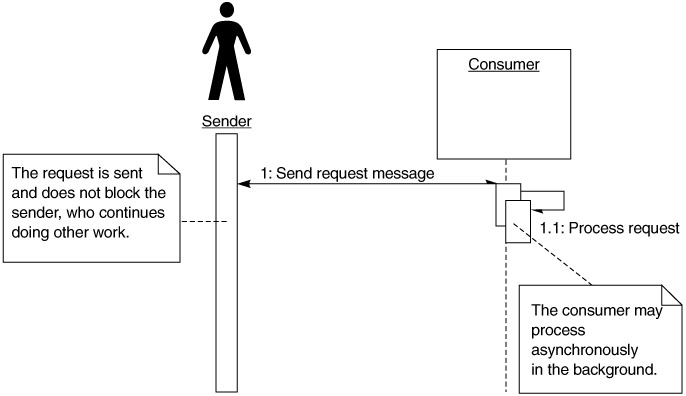 One-way messaging. The client sends a message and does not block or wait to receive a reply (Figure 11.27). It is free to do other work. This is analogous to sending a fax (fire and forget!) A number is dialed and a fax sent. You do not need a person to answer the other phone (just a fax machine). This also implements use cases corresponding to an asynchronous-update pattern, in which data on the receiver's side is updated with new values.