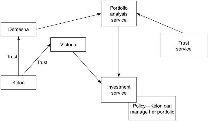 Kelon provides both Victoria and Demesha with a security token that allows both of them to access his portfolio (Figure 15.11). The security token contains claims that limit Demesha's ability to analyze the parts of his portfolio that do not contain stocks. This security token also allows Demesha to create successive security tokens, as long as the portfolio analysis service can prove it has a privacy certification from the third-party trust service.