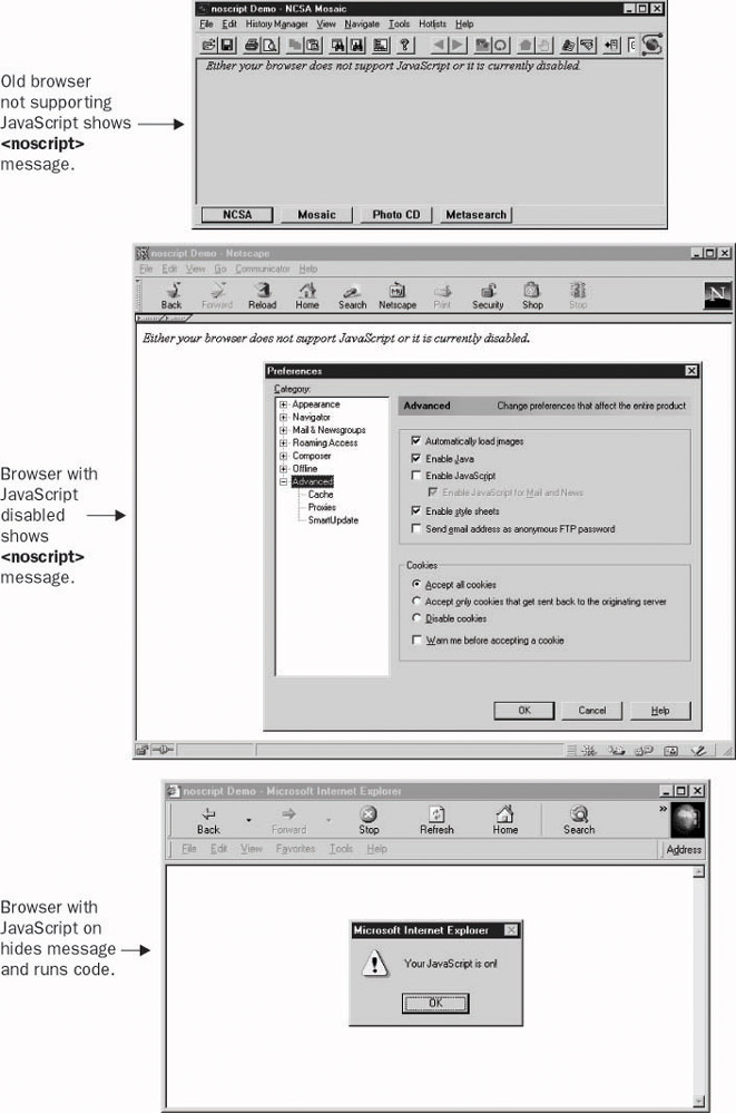 Figure 1-4 shows a rendering in three situations: first a browser that does not support JavaScript, then a browser that does support it but has JavaScript disabled, and finally a modern browser with JavaScript turned on.