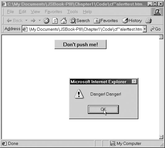 Notice that the src attribute is set to the value "danger.js". This value is a URL path to the external script. In this case, it is in the same directory, but it could have just as easily been an absolute URL such as http://www.javascriptref.com/scripts/danger.js. Regardless of the location of the file, all it will contain is the JavaScript code to run—no HTML or other Web technologies. So in this example, the file danger.js could contain the following script: