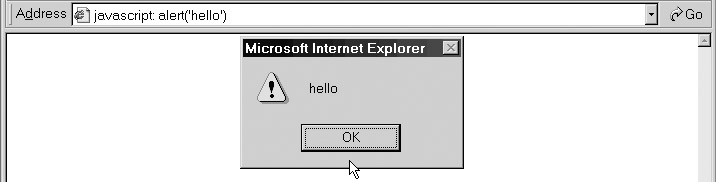 In most JavaScript-aware browsers, it is possible to invoke a script using the JavaScript pseudo-URL. A pseudo-URL like javascript: alert('hello') would invoke a simple alert displaying “hello” when typed directly in the browser’s address bar, as shown here: