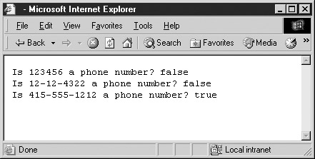 document.write("Is 123456 a phone number? ");document.writeln(isPhoneNumber("123456"));document.write("Is 12-12-4322 a phone number? ");document.writeln(isPhoneNumber("12-12-4322"));document.write("Is 415-555-1212 a phone number? ");document.writeln(isPhoneNumber("415-555-1212"));