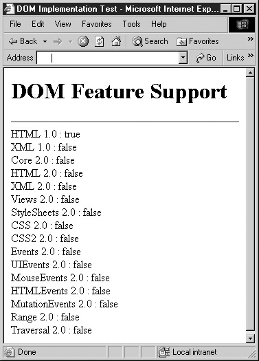 You’ll notice that the results shown in Figure 10-1 suggest that DOM support is spotty in the most popular browser, Internet Explorer.
