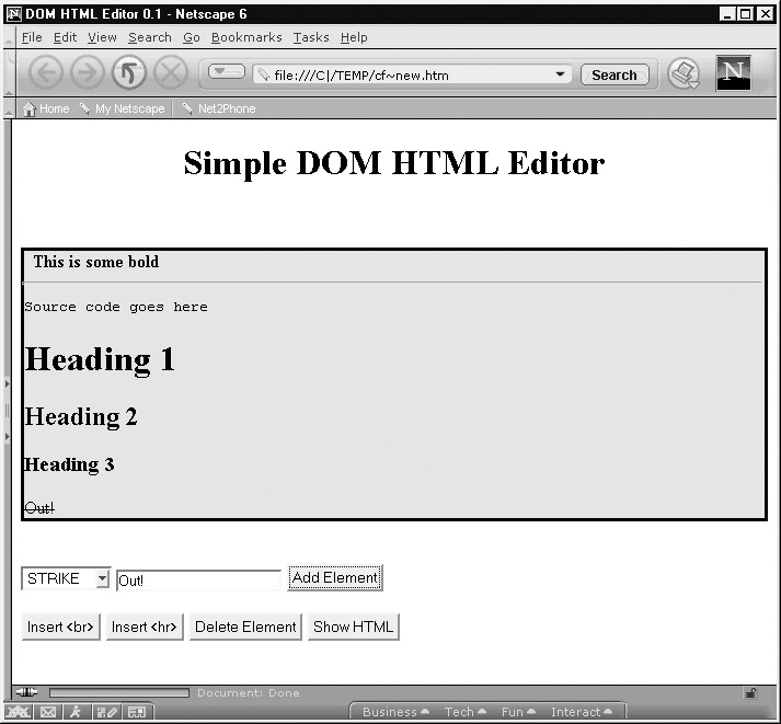 <<!DOCTYPE html PUBLIC "-//W3C//DTD XHTML 1.0 Transitional//EN" "http://www.w3.org/TR/xhtml1/DTD/xhtml1-transitional.dtd">> <<html xmlns="http://www.w3.org/1999/xhtml">> <<head>> <<title>>DOM HTML Editor 0.1<</title>> <<meta http-equiv="content-type" content="text/html; charset=utf-8" />> <<script type="text/javascript">> <<!-- function addElement() { var choice = document.htmlForm.elementList.selectedIndex; var theElement = document.createElement(document.htmlForm.elementList.options[choice].text); var textNode = document.createTextNode(document.htmlForm.elementText.value); var insertSpot = document.getElementById('addHere'); theElement.appendChild(textNode); insertSpot.appendChild(theElement); } function addEmptyElement(elementName) { var theBreak = document.createElement(elementName); var insertSpot = document.getElementById('addHere'); insertSpot.appendChild(theBreak); } function deleteNode() { var deleteSpot = document.getElementById('addHere'); if (deleteSpot.hasChildNodes()) { var toDelete = deleteSpot.lastChild; deleteSpot.removeChild(toDelete); } } function showHTML() { var insertSpot = document.getElementById('addHere'); if (insertSpot.innerHTML) alert(insertSpot.innerHTML); else alert("Not easily performed without innerHTML"); } //-->> <</script>> <</head>> <<body>> <<h1 style="text-align: center;">>Simple DOM HTML Editor<</h1>> <<br />><<br />> <<div id="addHere" style="background-color: #ffffcc; border: solid;">> <</div>> <<br />><<br />> <<form id="htmlForm" name="htmlForm" action="#" method="get">> <<select id="elementList" name="elementList">> <<option>>B<</option>> <<option>>BIG<</option>> <<option>>CITE<</option>> <<option>>CODE<</option>> <<option>>EM<</option>> <<option>>H1<</option>> <<option>>H2<</option>> <<option>>H3<</option>> <<option>>H4<</option>> <<option>>H5<</option>> <<option>>H6<</option>> <<option>>I<</option>> <<option>>P<</option>> <<option>>U<</option>> <<option>>SAMP<</option>> <<option>>SMALL<</option>> <<option>>STRIKE<</option>> <<option>>STRONG<</option>> <<option>>SUB<</option>> <<option>>SUP<</option>> <<option>>TT<</option>> <<option>>VAR<</option>> <</select>> <<input type="text" name="elementText" id="elementText" value="Default" />> <<input type="button" value="Add Element" onclick="addElement();" />> <<br />><<br />> <<input type="button" value="Insert <<br>>" onclick="addEmptyElement('BR');" />> <<input type="button" value="Insert <<hr>>" onclick="addEmptyElement('HR');" />> <<input type="button" value="Delete Element" onclick="deleteNode();" />> <<input type="button" value="Show HTML" onclick="showHTML();" />> <</form>> <</body>> <</html>>