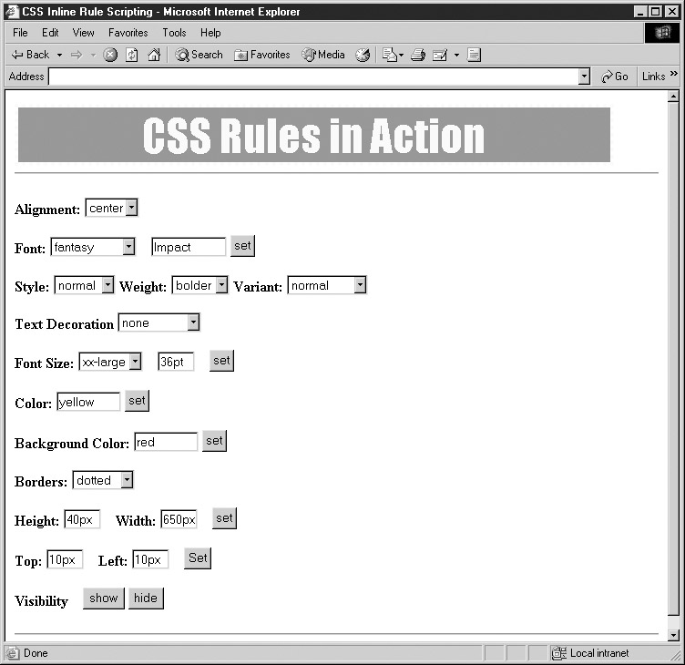 You may find that this example does not work well under some browsers. It also may suffer refresh problems because rule-removal may not necessarily be reflected automatically. If you enable or disable rules or refresh a document, you may notice changes. |