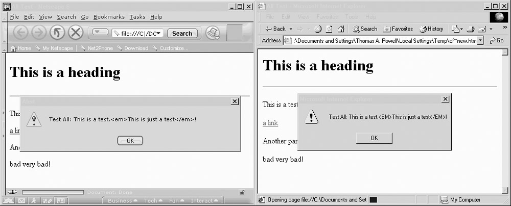 Note that this example really doesn’t create a perfectly compatible all[] collection for Mozilla or other DOM-aware browsers, since Microsoft’s all[] collection will include comments and both the start and end tag of an unknown element. The two dialogs presented here show this difference: