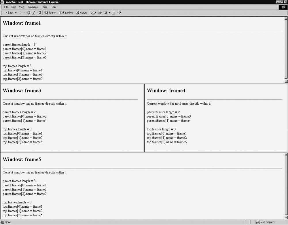 The parent property allows a window to determine the parent window. We could also use the top property that provides us a handle to the top window that contains all others. This would be written top.frames.length. You do need to be careful, though; unless you have nested frames, the parent and top may actually be one and the same.