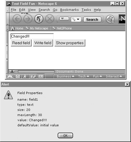<<!DOCTYPE html PUBLIC "-//W3C//DTD XHTML 1.0 Transitional//EN" "http://www.w3.org/TR/xhtml1/DTD/xhtml1-transitional.dtd">> <<html xmlns="http://www.w3.org/1999/xhtml">> <<head>> <<title>>Text Field Fun<</title>> <<meta http-equiv="content-type" content="text/html; charset=utf-8" />> <<script type="text/javascript">> <<!-- function showProps(textfield) { var prop, str="Field Properties\n\n"; str += "name: "+textfield.name + "\n"; str += "type: "+textfield.type + "\n"; str += "size: "+textfield.size + "\n"; str += "maxLength: "+textfield.maxLength + "\n"; str += "value: "+textfield.value + "\n"; str += "defaultValue: "+textfield.defaultValue + "\n"; alert(str); } //-->> <</script>> <</head>> <<body>> <<form action="#" method="get" id="myform" name="myform">> <<input type="text" id="field1" name="field1" size="20" maxlength="30" value="initial value" />><<br />> <<input type="button" value="Read field" onclick="alert(document.myform.field1.value);" />> <<input type="button" value="Write field" onclick="document.myform.field1.value='Changed!!!';" />> <<input type="button" value="Show properties" onclick="showProps(document.myform.field1);" />> <</form>> <</body>> <</html>>