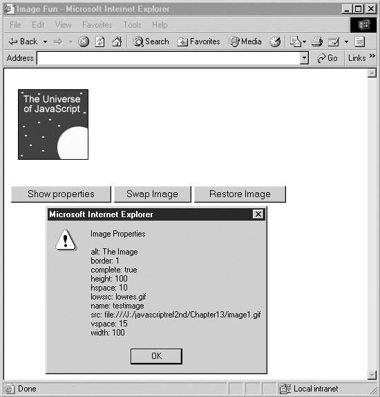 We’ll explore all these properties again in more detail in Chapter 15 and we’ll see how to create a common JavaScript effect called the rollover button using the Image object.