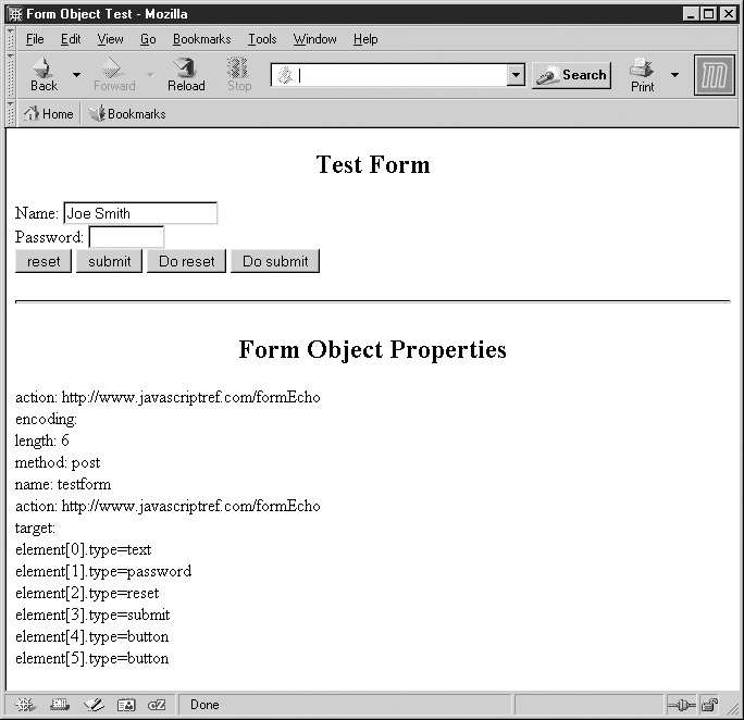 Before taking a look at the objects that represent the different kinds of form fields, we present a brief example to demonstrate the access of the various Form object properties and methods.