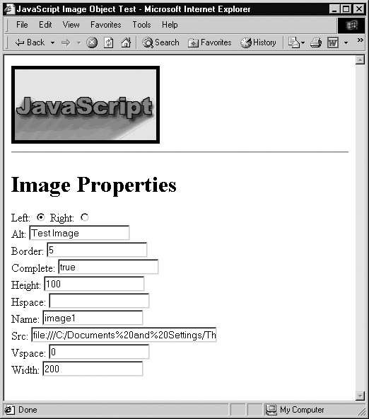 If you try this example under much older browsers such as Netscape 3, you will find that it is not possible to manipulate the properties of the Image object, except for the src attribute. |