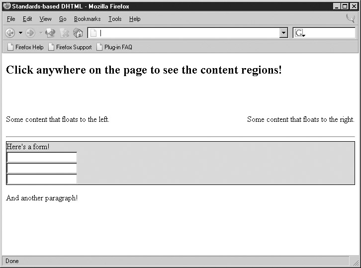 <<!DOCTYPE html PUBLIC "-//W3C//DTD XHTML 1.0 Transitional//EN" "http://www.w3.org/TR/xhtml1/DTD/xhtml1-transitional.dtd">> <<html xmlns="http://www.w3.org/1999/xhtml">> <<head>> <<title>>Standards-based DHTML<</title>> <<meta http-equiv="content-type" content="text/html; charset=utf-8" />> <<script language="JavaScript" type="text/javascript">> <<!-- var prevObj; // So we can revert the style of the previously clicked element function handleClick(e) { if (!e) var e = window.event; // e gives access to the event in all browsers // If they previously clicked, switch that element back to normal if (prevObj) { switchAppearance(prevObj); } if (e.target) // DOM { prevObj = e.target; switchAppearance(e.target); } else if (e.srcElement) // IE { prevObj = e.srcElement; switchAppearance(e.srcElement); } } function switchAppearance(obj) { obj.style.backgroundColor = ((obj.style.backgroundColor == "lightblue") ? ("") : ("lightblue")); // IE can't handle a value of inherit so pass it a blank value // Avoid messing with the border around form fields if (obj.tagName.toLowerCase() != "input") { if (obj.style.borderStyle.indexOf("solid") != -1) { obj.style.borderStyle = "none"; obj.style.borderWidth = "0px"; } else { obj.style.borderStyle = "solid"; obj.style.borderWidth = "1px"; } } } // Register DOM style events if (document.addEventListener) document.addEventListener("click", handleClick, true); // Register IE style events if (document.attachEvent) document.attachEvent("onclick",handleClick); //-->> <</script>> <</head>> <<body>> <<h2>>Click anywhere on the page to see the content regions!<</h2>> <<br />><<br />> <<p style="float: left;">>Some content that floats to the left.<</p>> <<p style="float: right;clear: none;">>Some content that floats to the right.<</p>> <<br clear="all"/>><<hr />> <<form action="#" method="get">> Here's a form!<<br />> <<input type="text" />><<br />> <<input type="text" />><<br />> <<input type="text" />><<br />> <</form>> <<p>>And another paragraph!<</p>> <</body>> <</html>>