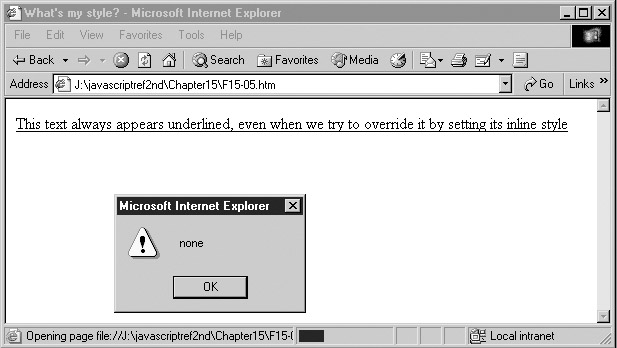 As you can see in Figure 15-5, the text remains underlined even though we’ve set the inline style property to “none.” The reason is that there is a CSS rule in the document-wide style sheet that overrides the inline setting using !important. However, alerting the style value clearly shows that the value for textDecoration is none, which is somewhat confusing.