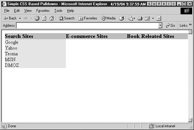To remind you of the trouble with DHTML-based solutions, we implement this particular example not only in DOM style, but in the IE document.all and Netscape 4 layers style as one final reminder of the challenges with JavaScript-based navigation.