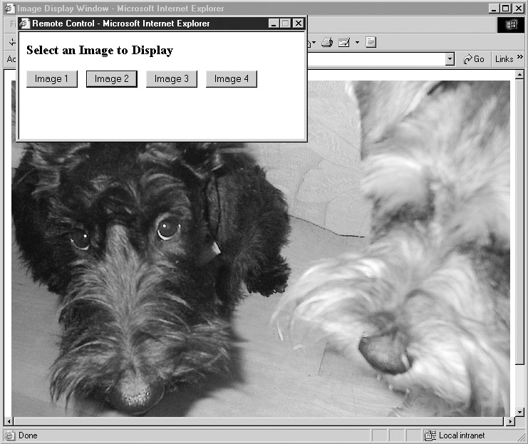 Now you need the remote control window (remotecontrol.html) that this window will load. It will contain the JavaScript setting displayedImage.src in the previous document.