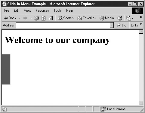 The following code illustrates the basic technique with which slide-in menus are usually implemented. The idea is to initially place the layer off the left side of the screen and then incrementally move the menu onto the screen while the mouse is over it. A timer wakes the scrolling function up at regular intervals, at which times the menu is moved slightly farther to the right. Once a predefined menu position is reached, the timer is cleared in order to stop the scrolling. When the user moves the mouse away from the menu, the scrolling function is invoked at regular intervals to move the layer back to its original position. Note that your users may find it more convenient if the menu is placed directly on the screen when activated (rather than having it slide in).