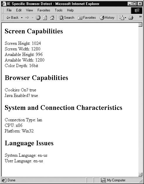 Microsoft introduced client capabilities detection in Internet Explorer 5 using a default behavior. We’ll discuss behaviors in Chapter 21, but for now, take a look at the simple example here; it illustrates Explorer’s client capabilities detection, which detects many useful properties, including connection speed.