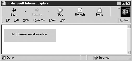 The JavaScript properties, defined primarily under the browser object model and later by the DOM, of an Applet object are listed in Appendix B and consist of an unsurprising assortment of information reflecting the attributes of the (X)HTML <<applet>> tag for which it was defined. The relevant aspect to this JavaScript-Java communication discussion is the fact that all properties and methods of the applet’s class that are declared public are also available through the Applet object. Consider the following Java class definition for the previous myhelloworld example. The output (when embedded as before) is shown in Figure 18-1.