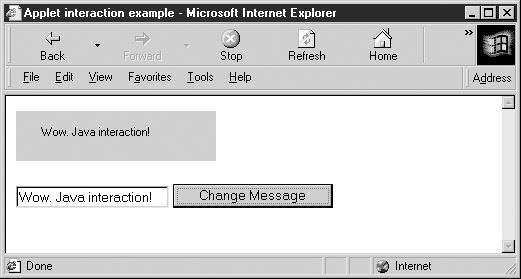 Now comes the interesting part. Because the setMessage() method of the myhelloworld class is declared public, it is made available in the appropriate Applet object. We can invoke it in JavaScript as
