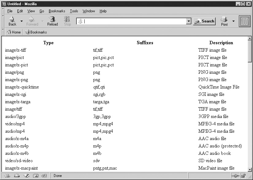 Netscape 3+, Opera 4+, and Mozilla-based browsers provide an easy way to examine the ability of the browser to handle particular MIME types. The mimeTypes[] property of the Navigator object holds an array of MimeType objects. Some interesting properties of this object are shown in Table 18-1.