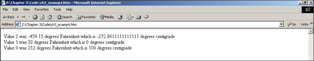 Let's change our temperature converter so that it converts a series of values, stored in an array, from Fahrenheit to centigrade. We will be using the for statement to go through each element of the array. Type in the code and save it as ch3_examp4.htm.