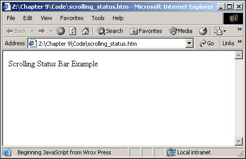 Save the page as scrolling_status.htm and load it into your browser. In the status bar at the bottom of the browser's window, you'll see this scrolling message: Beginning JavaScript from Wrox Press.