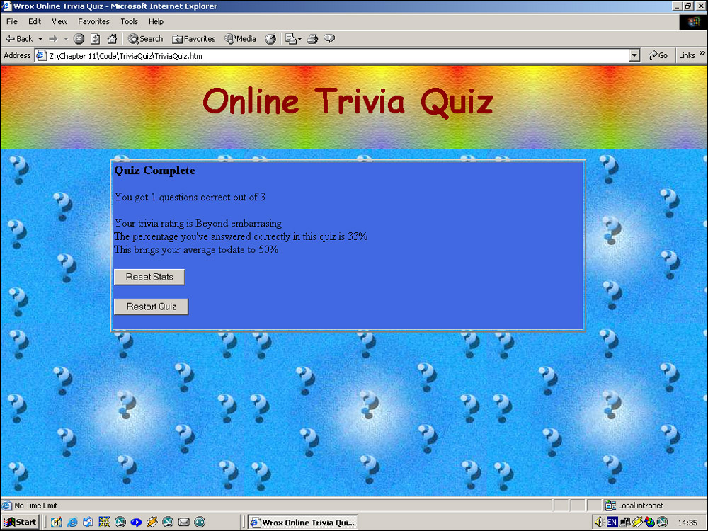 questionhtml = questionhtml + "<br>This brings your average todate to " + currentAvgScore + "%" questionhtml = questionhtml + "<p><input type=button " + "value='Reset Stats' " + "onclick=\"window.top.fraTopFrame.fraGlobalFunctions.setCookie" + "('previousNoAsked', 0,'','1 Jan 1970')\" " + "name=buttonReset>" questionhtml = questionhtml + "<p><input type=button " + "value='Restart Quiz' " + "onclick=\"window.location.replace('quizpage.htm')\" " + "name=buttonRestart>"