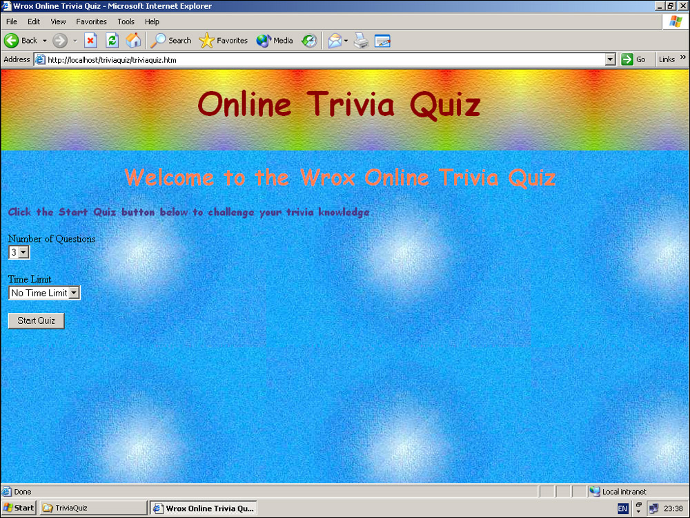 Before we make any changes to the trivia quiz's code, we need to make the directory containing the trivia quiz web shared, so that visitors to our web server can view it. The easiest way to do this is to make the directory containing the trivia quiz a virtual directory and give it the alias TriviaQuiz. We can do this either from Windows Explorer by right-clicking the directory and selecting Properties, then web sharing, or we can use the Advanced tab in the IIS console. (See the section "Managing IIS under Windows XP" earlier in this chapter for details on how to do this.)