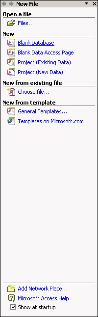 First open up Access. Once it's opened create a new database by clicking the "New Database" link if you're using Access XP. If you're using an older version, select Blank Access database from the dialog box and click OK. (See Figure 17-1.)