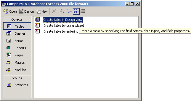 In the view as shown in Figure 17-3, make sure that Tables is selected under Objects; then double-click Create table in Design view.