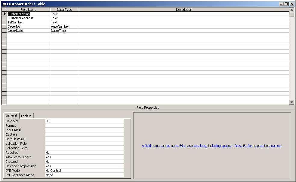 We'll first create the CustomerOrder table, so double-click Create table in Design view, and then create the fields as shown in Figure 17-7. Note again that the properties of each field under the General tab can be left at their default values except CustomerAddress, which needs a Field Size of 255, and TelNumber, which needs a Field Size of 25.