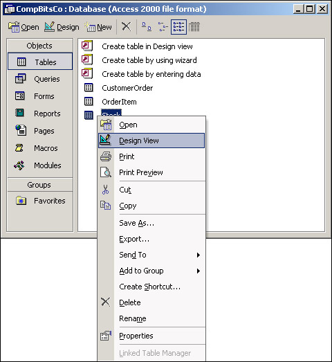 From the table view, right-click the Stock table and select Design View, as shown in Figure 17-9. You can also select the Design icon from the toolbar.