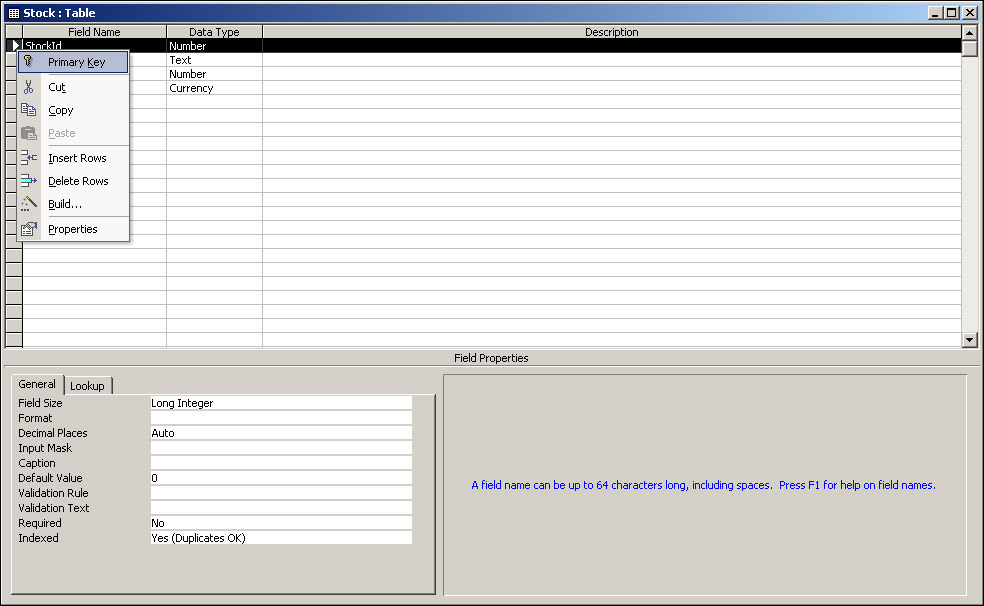 The primary way of looking up information in the Stock table is the StockId field that we just created. We can speed up the look-up of data in key fields such as StockId by making it the primary key. What this really means is that the field is indexed internally by Access so that it can do data lookups a lot faster. By saying it's the primary key, we're saying it's the most important index. We can define other indexes, but only one primary index or primary key, although as we'll see later, the primary key can be made up of more than one field. To make StockId the primary key in Access, we simply right-click the StockId field and select Primary Key from the menu shown in Figure 17-12. Note that a primary key must contain unique data. So, for example, we couldn't have two stock ids with the value 28.