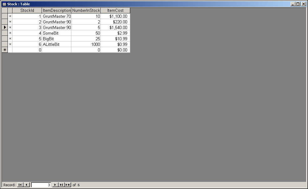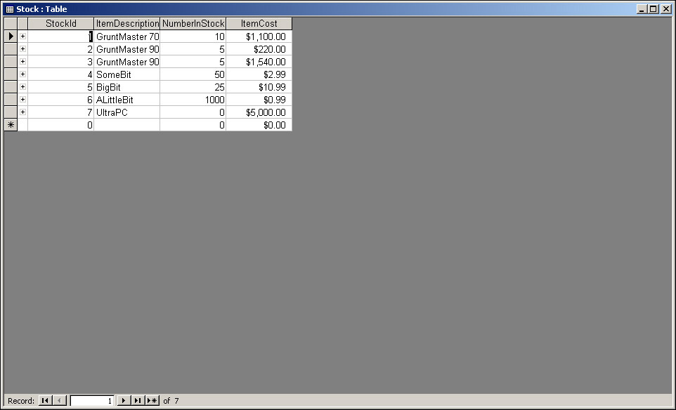 We mentioned earlier the concept of a record, which consists of data corresponding to a group of fields. For example, if we had an item called a Widget, with 10 in stock, and they cost $10.99, then our ItemDescription field would hold Widget. NumberInStock would hold 10, and ItemCost would hold $10.99. Collectively this data is called a record. A table can have many, many records. For example, a second record might show that ItemDescription is BigWidget, NumberInStock is 7, and ItemCost is $16.99.