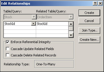 In the Relationships window, click the StockId field in the OrderItem table and, keeping your mouse button down, drag over to the StockId field in the Stock table before releasing your mouse button; the Edit Relationships dialog box will appear. We want to ensure that the relationship is enforced, so make sure the Enforce Referential Integrity box is checked. Once we've done this, we click the Create button and the new relationship will be defined and data integrity enforced. (See Figure 17-17.)