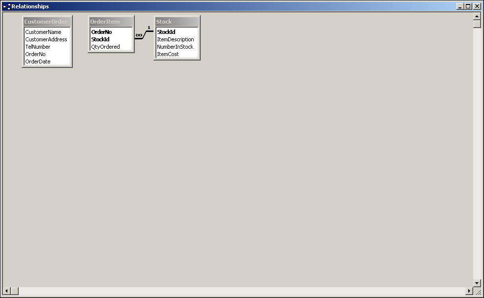 The relationship is displayed on the diagram by a line connecting the related fields in each table. It also indicates the type of relationship, such as one-to-one, one-to-many, or many-to-many. We can see in Figure 17-18 that Access has put a 1 next to the StockId field in the Stock table and has put an infinity symbol (Ґ) next to the OrderItem table indicating that there can be as many of the same StockId values in this table as we wish.