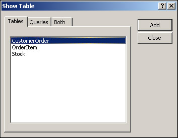 Because this is the first time we've opened up the relationship tool, we'll be given the option of adding tables from our database onto the relationship diagram in the Show Table window. Double-clicking each of the tables in turn will add it to the diagram. After all three tables have been added to the diagram, as shown in Figure 17-16, click Close.