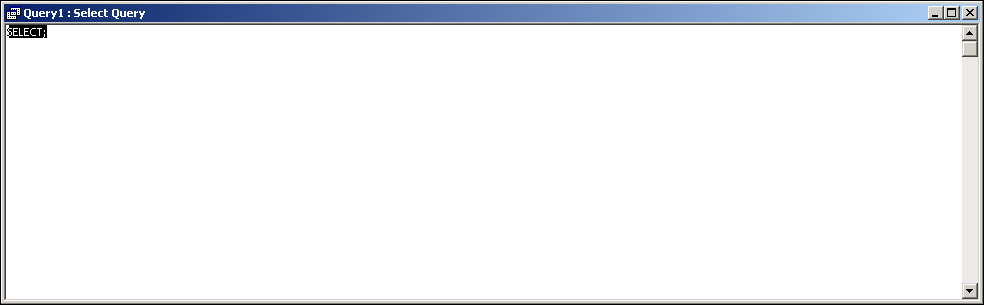 Because we're learning about SQL, we want to create the SQL ourselves rather than have Access do it for us. To switch to the SQL view, we first need to click the Close button in the Show Table window. Next click the SQL icon in the toolbar and we'll be taken to the SQL view, with just the word select; inside the SQL editing box, as shown in Figure 17-21.