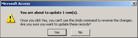 You can try this query in Access as we did for the select query by selecting Queries from the Objects tab, clicking Create query in Design view, and then switching to the SQL view. When you run the query, Access will tell you how many records will be updated and give you the chance to cancel the query, as shown in Figure 17-24. We click Yes to proceed with the update.