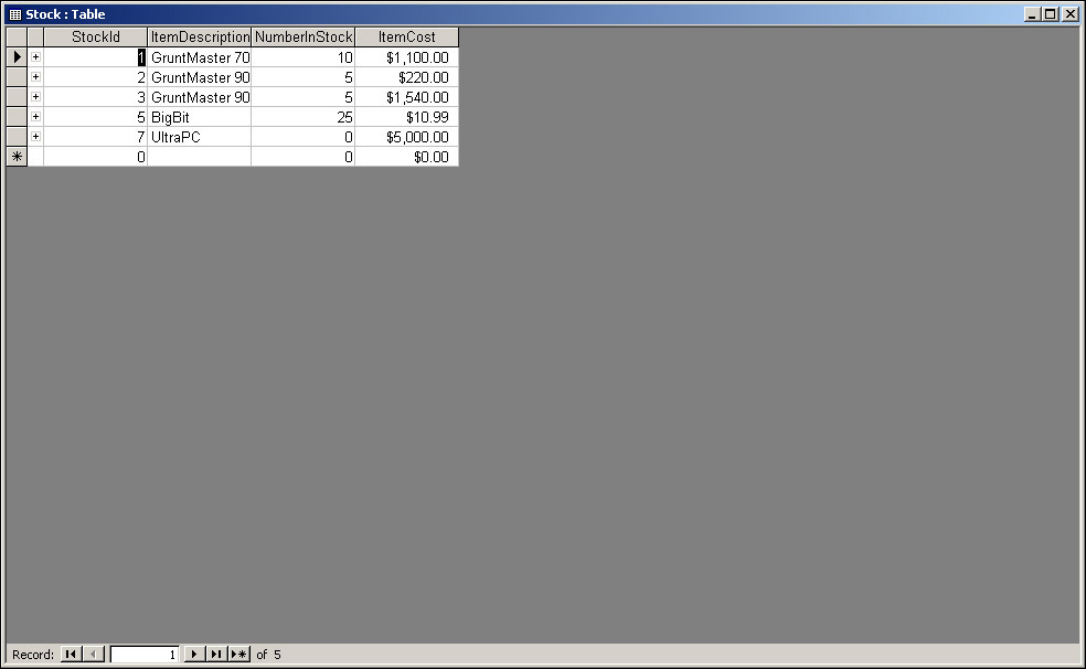 For example, to insert a new stock item called an UltraPC that costs $5000 and that isn't in stock, our SQL would be as follows: