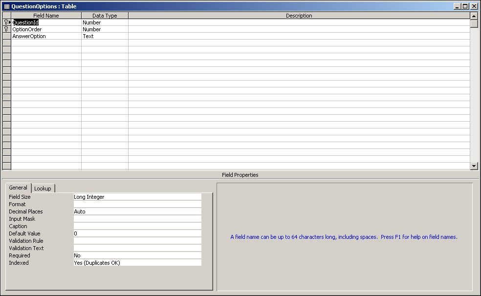 Create the Question table first. The fields are shown in Figure 17-47, along with suggested field sizes, which we change under the General tab.