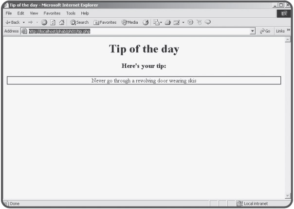 Your first program probably won't win any Web awards, but it will take you beyond what you can do with regular HTML. Figure 1.1 illustrates the "Tip of the day" page, which offers friendly, helpful advice.