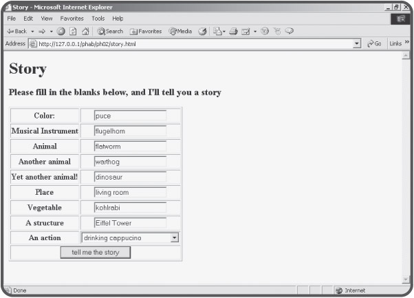 The program asks the user to enter some values into an HTML form, and then uses those values to build a custom version of a classic nursery rhyme. The story program works like most server-side programs. It has two distinctive parts. First, the user enters information into a plain HTML form and hits the submit button. The PHP program doesn't execute until after the user has submitted a form. The program takes the information from the form and does something to it. Usually the PHP program also returns an HTML page to the user.
