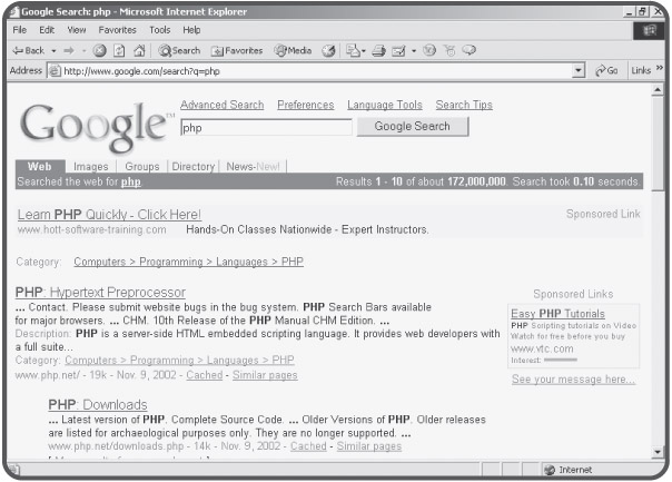 Whenever the user clicks on this link, it sets up a get-method query to google's search program. The result is a nifty Google search. One fun thing you might want to do is figure out how to set up "canned" versions of your most common queries in various search engines so you can get updated results with one click. Figure 2.11 illustrates what happens when the user clicks on the "google php" link in the linkDemo page.