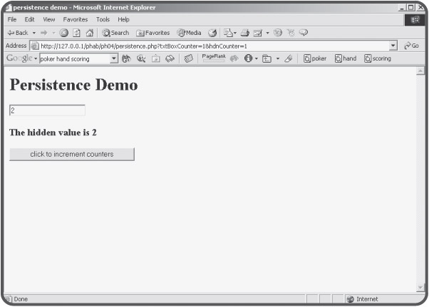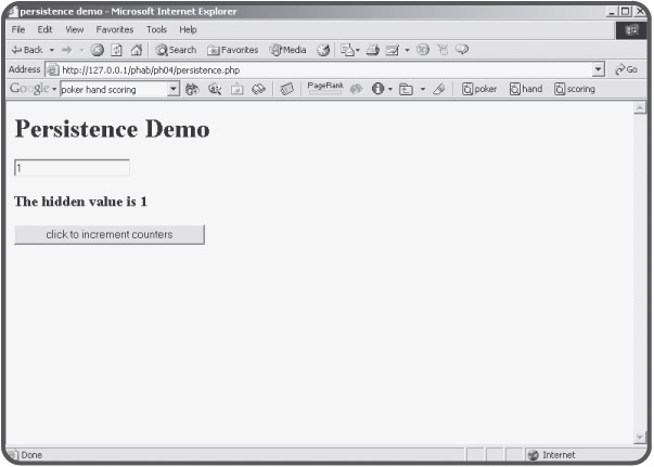 <html> <head> <title> persistence demo </title> </head> <body> <h1>Persistence Demo</h1> <form> <? //increment the counters $txtBoxCounter++; $hdnCounter++; print <<<HERE <input type = "text" name = "txtBoxCounter" value = "$txtBoxCounter"> <input type = "hidden" name = "hdnCounter" value = "$hdnCounter"> <h3>The hidden value is $hdnCounter</h3> <input type = "submit" value = "click to increment counters"> HERE; ?> </form> </body> </html>