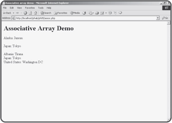 While it sounds complicated, an associative array is much like a normal array. While regular arrays rely on numeric indices, an associative array has a string index. Figure 5.5 shows a page created with two associative arrays.