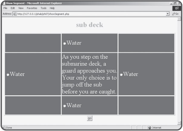 Databases are a serious tool but they can be fun, too. The adventure generator program shown in Figures 7.1 through 7.4 shows how a database can be used to fuel an adventure game generator. The adventure generator is a system that allows users to create and play simple "multiple choice" adventures. This style of game consists of several nodes. Each node describes some sort of decision. In each case, the user will be able to choose from up to three choices. The user's choice leads to a new decision. If the user makes a sequence of correct choices, he or she will win the game.