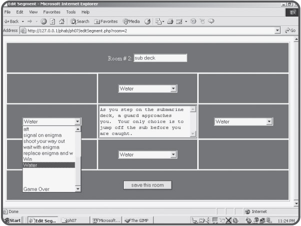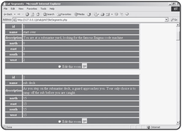 This program is interesting as a game, but the really exciting part is how the user can modify this game. A user can use the same system to create and modify adventures. Figure 7.3 shows the data behind the enigma game. Note that you can edit any node of the game by clicking on the appropriate button from this screen.
