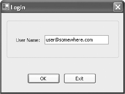 The login form (shown in Figure 4-3) is quite straightforward. It exposes a public UserName property, which allows the Startup routine to retrieve the user name without violating encapsulation. This property could also be used to pre-fill the txtUser textbox by retrieving the previously used name, which could be stored in a configuration file or the Windows registry on the current computer.